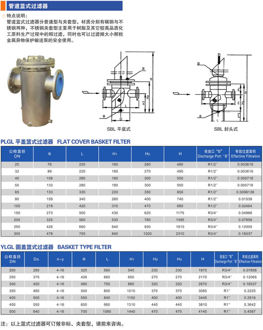 管道藍式過濾器分普通型與夾套型,材質分別有碳鋼與不銹鋼兩種,不銹鋼夾套型主要用于樹脂及其他較高品質化工原料生產過程中的粗過濾,同時也可以過濾掉大小顆粒金屬異物,保護輸送泵的安全使用。