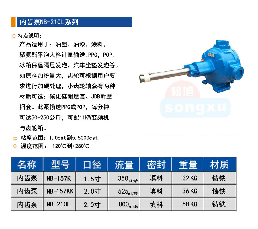 產品適用于:油墨,油漆,涂料,聚氨酯平泡大料計量輸送,PPG,POP,冰箱保溫隔層發泡,汽車坐墊發泡等。如原料加粉量大,齒輪可根據用戶要求進行加硬處理,小齒輪軸套有兩種材質可選:碳化硅耐磨套、JDB耐磨銅套。此泵輸送PPG或POP,每分鐘可達50-250公斤,可配11KW變頻機與齒輪箱。