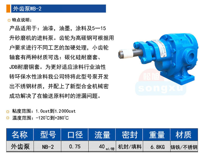 產品適用于:油漆,油墨,涂料及5一15 升砂磨機的進料泵。齒輪為高碳鋼可根據用 戶要求進行不同工藝的加硬處理,小齒輪 軸套有兩種材質可選:碳化硅耐磨套、 JDB耐磨銅套。為更好適應涂料行業油性 轉環保水性涂料我公司特將此型號泵開發 出不繡鋼材質,并配上了新型合金機械密 成功解決了在輸送原料時的泄漏問題。