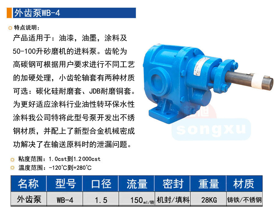 產品適用于:油漆,油墨,涂料及 50-100升砂磨機的進料泵。齒輪為 高碳鋼可根據用戶要求進行不同工藝 的加硬處理,小齒輪軸套有兩種材質 可選:碳化硅耐磨套、JDB耐磨銅套。 為更好適應涂料行業(yè)油性轉環(huán)保水性 涂料我公司特將此型號泵開發(fā)出不繡 鋼材質,并配上了新型合金機械密成 功解決了在輸送原料時的泄漏問題。