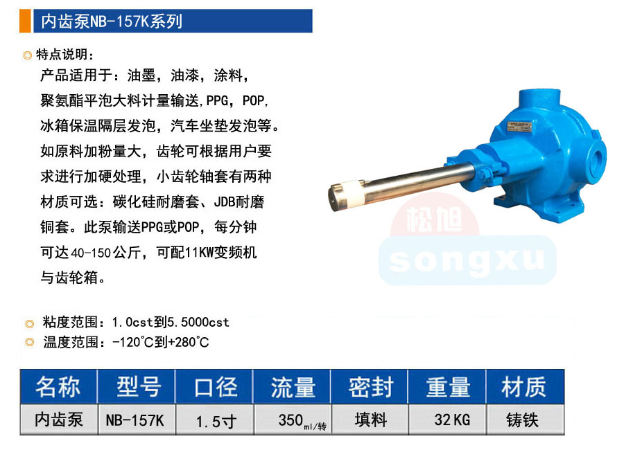 產品適用于:油墨,油漆,涂料,聚氨酯平泡大料計量輸送,PPG,POP,冰箱保溫隔層發泡,汽車坐墊發泡等。如原料加粉量大,齒輪可根據用戶要求進行加硬處理,小齒輪軸套有兩種材質可選:碳化硅耐磨套、JDB耐磨銅套。此泵輸送PPG或POP,每分鐘可達40-150公斤,可配11KW變頻機與齒輪箱。